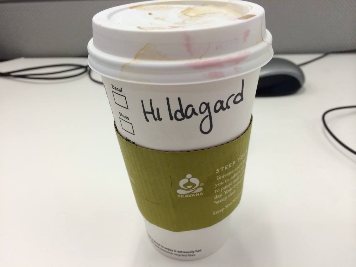hildegardeEven with that rocky start, I’ve played The Name Game on every business trip since then, choosing one name for the trip, and seeing what I can get as far as really funny spellings.  I’ve been Ursula, Agatha, Agnes (pronounced in French), Constance, Athalea, Hildegarde, and whatever else my friends would suggest. All with varying success as far as hysterical misspellings.