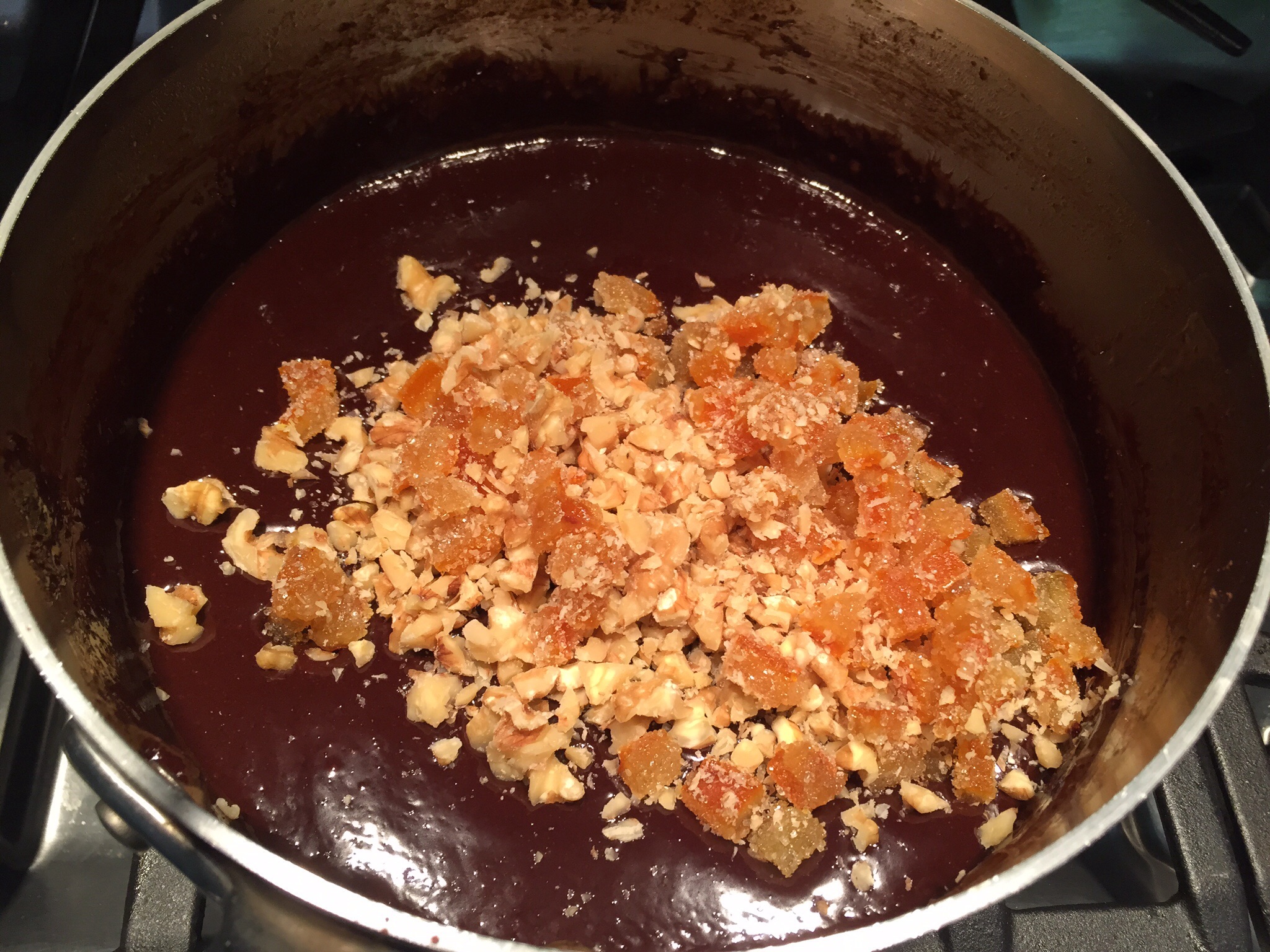1 cup chopped walnuts, hazelnuts, almonds or pecans, depending on the taste you wish. If you do the orange flavoring, I chop up candied orange peel. Let me know if you want that recipe, or you can find it at specialty cooking shops, or on Amazon.