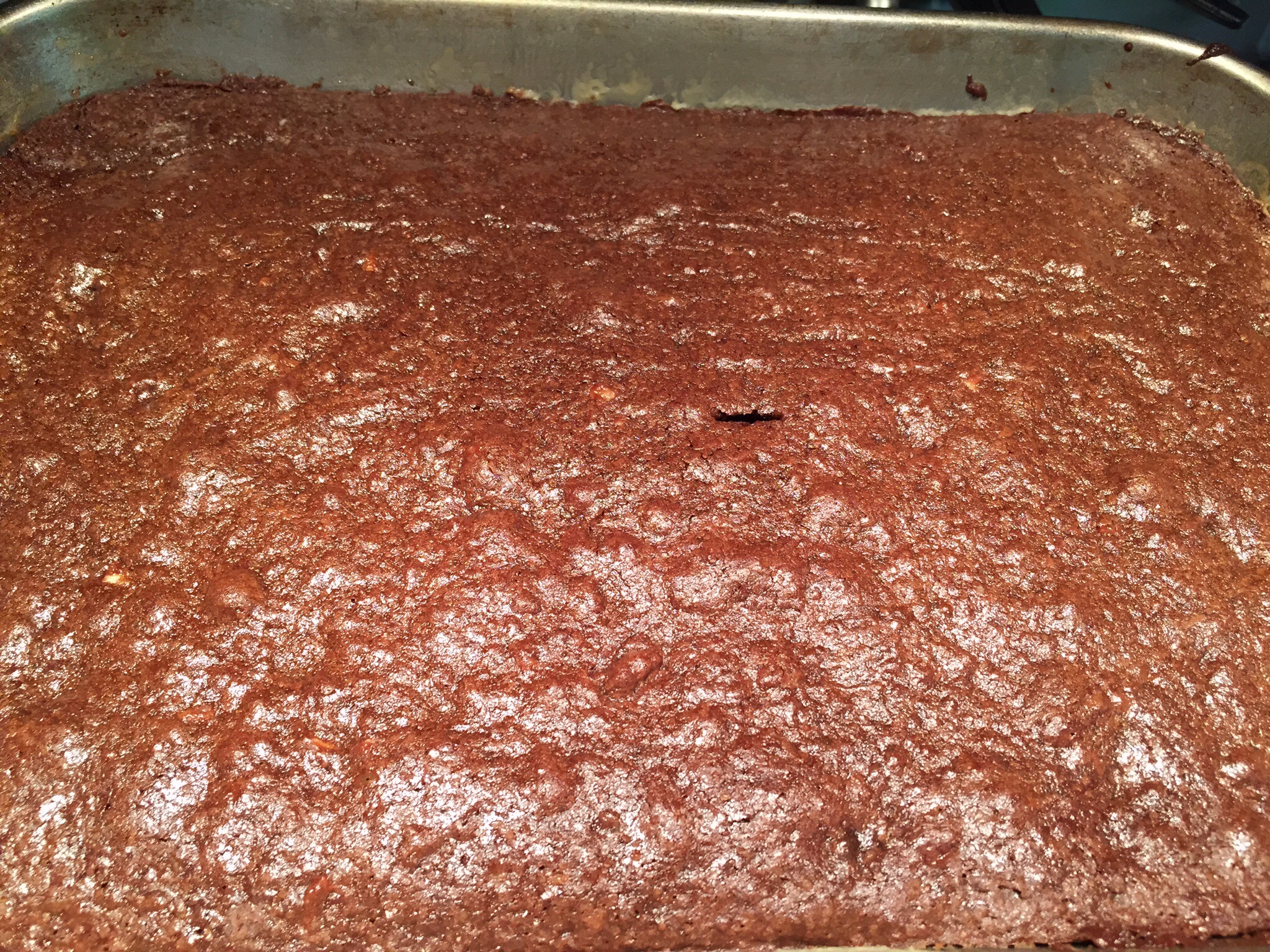 Remove from heat. Immediately add sugar, cocoa, water, vanilla or other extract and salt. Stir to blend with wire whisk. Let cool at least 10 minutes – you want the mixture to still be hot, just not so hot it will scramble the eggs. Add eggs, beating vigorously. When mixture looks nice and shiny, add flour and stir until blended. Beat vigorously until smooth and satiny. Add in the liqueur or water. Beat 1 minute.