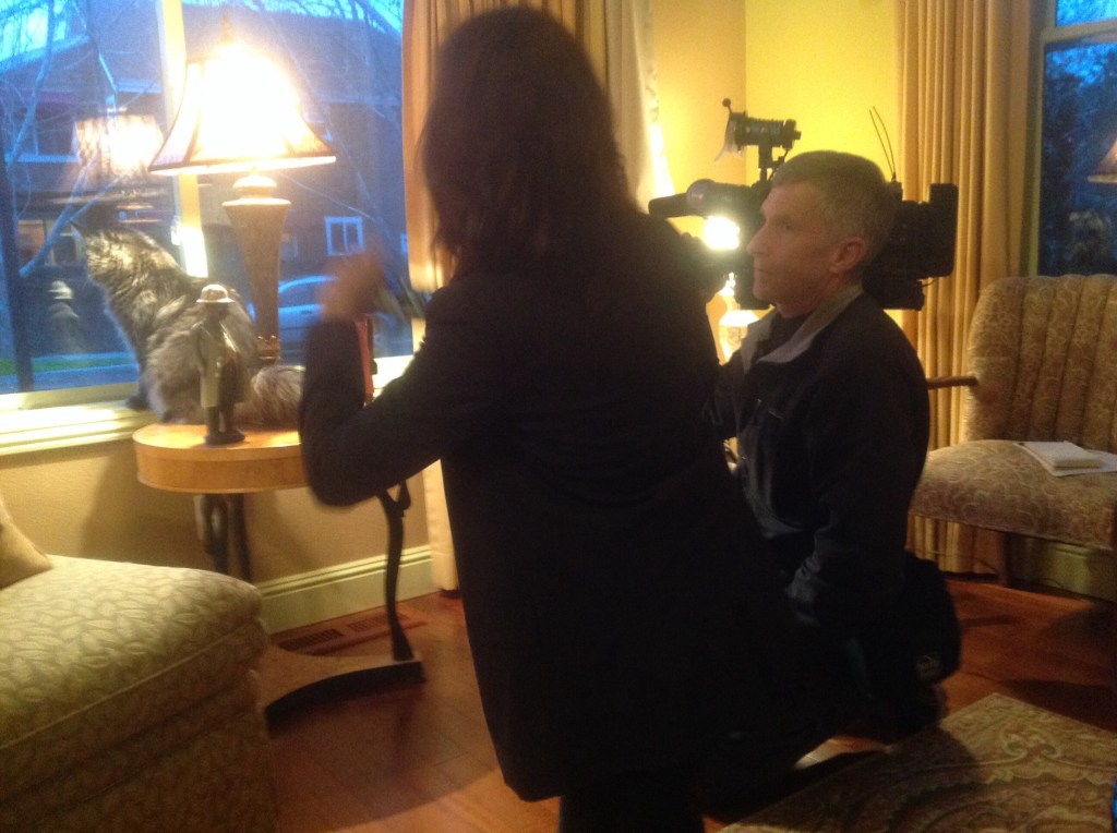 They wanted to include some neighbor interviews, but the closest ones were still at work. So, I figured I’d pay Terry back, and called him to come over. I don’t know who worked the camera better – Terry or Spock.  Then my darling next door neighbor and her adorable boys came home – just in time for the boys to be included in the spot. Tomas and Nico were incredibly good. Too bad their answers to questions was cut from the final report. Still, their cuteness shows. Kids and pets – what’s not to like?